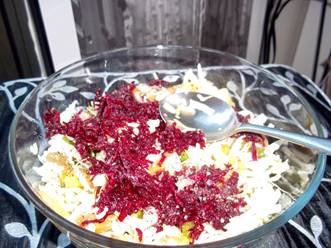Grate cabbage & beetroot. Chop pineapple in thin slices and bellpepper into